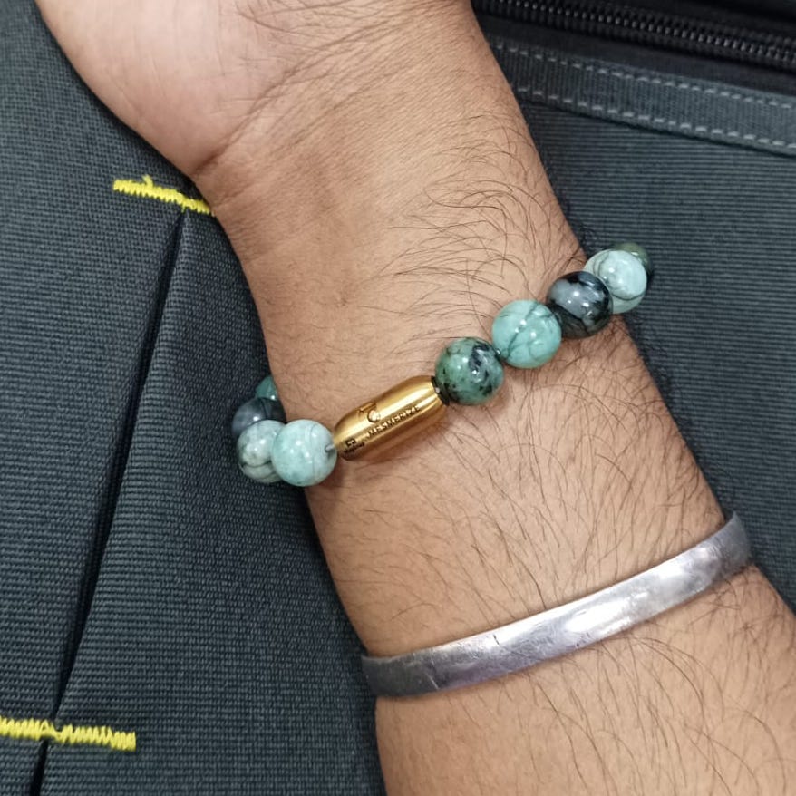 - Emerald (Also known as Panna) –Crafted with natural Emerald stones, this bracelet is believed to be a “stone of growth and wisdom.” Long valued for its connection to the heart chakra, Emerald is thought to support emotional healing while encouraging compassion, clarity, and inner strength. It’s said to aid in attracting prosperity, calming the mind, and boosting mental focus making it ideal for those seeking balance in both thought and emotion. Emerald is also believed to offer subtle protection from negativity while guiding you toward personal growth and spiritual insight.